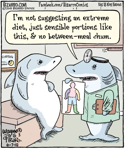 The average American is so large these days that sharks off the coast of the U.S. carry to-go containers. When I posted this cartoon on Instagram, several commenters mentioned that sharks do not eat humans. I reminded them that they also do not have medical practices.