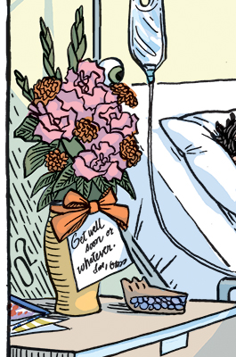Hospital stays can be tons of fun, to be sure, but this guy is having less fun than he would if his doctor wasn’t sitting on his lap. Perhaps the problem would be less acute if the doctor were lighter and more attractive to the patient, but it wouldn’t solve it completely. Also, in case you can’t see it on your screen here, don’t miss the message on the flower card.