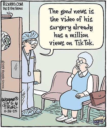 I’m Dan Piraro, the creator of the Bizarro newspaper comic, and this is my weekly blog post. The large Sunday Bizarro comic above is mine, as are the comments below. The past week’s Monday-Saturday Bizarro comics that follow were written and drawn by my partner Wayno. For more fun, check out Wayno’s weekly blog post.