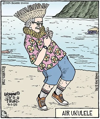 If you’re an accomplished air guitar player, as I am, you’ll enjoy Wayno’s version of the art form with ukulele. Wayno plays a 3-D ukulele in his 3-D life, so he draws this character from experience. If you’d like to see the selfie he took for reference, it’s here in the latest edition of his free, weekly newsletter. (Not the same as his weekly cartoon roundup blog post.) You’ll admire both his dedication to the role and the shirt he’s wearing in the photo.