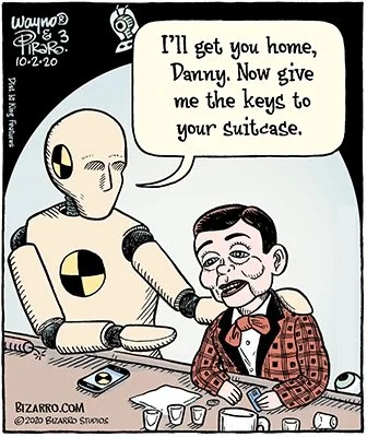 Here’s a different take on a similar scene from Wayno. I love that it employs two common cartoon tropes at once, making the humor multidirectional. I’m assuming it’s just a coincidence that he named the dummy “Danny.”