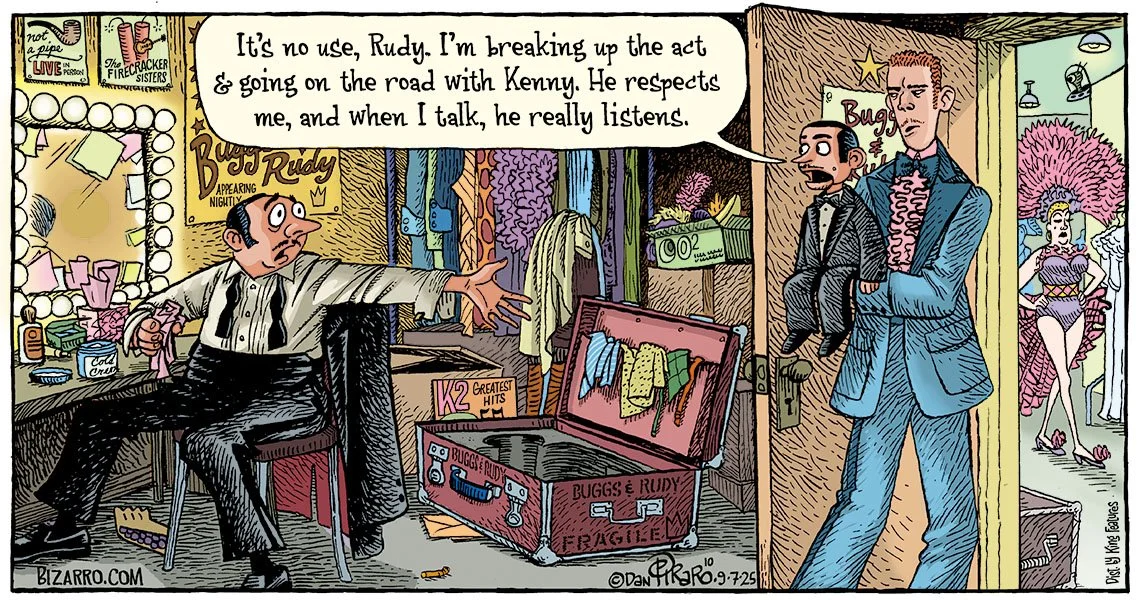 I drew this one ages ago, but as I write this, it reminds me of the kind of thing RFK Jr. might do when testifying before Congress. I could see him bringing a ventriloquist dummy to testify as an expert on one of his crackpot theories. Of course, the question of which one is the dummy would be inescapable.