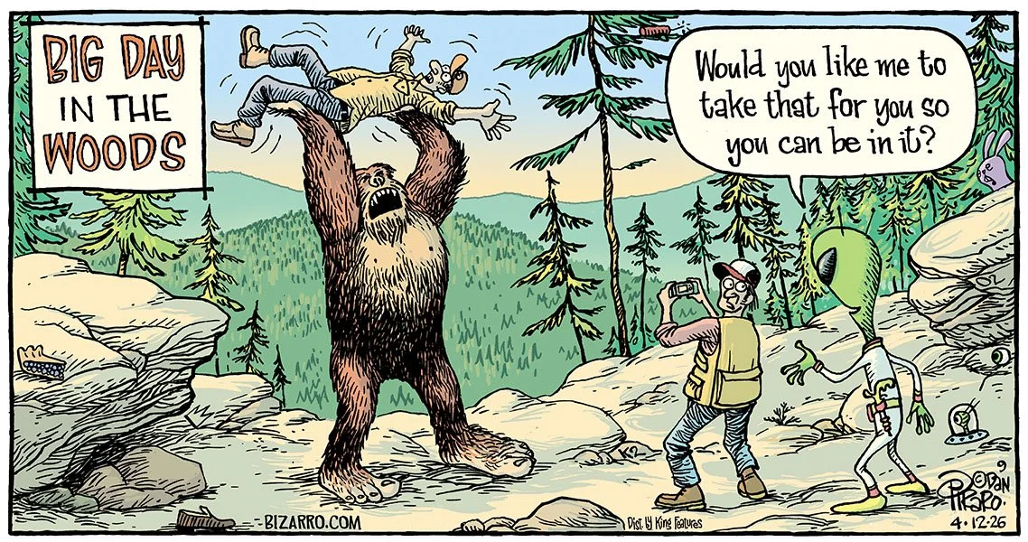 Seeing Bigfoot and a space alien at the same moment would be as overwhelming as it would be hilarious. I added to it the popular social phenomenon of offering to take photos of strangers.