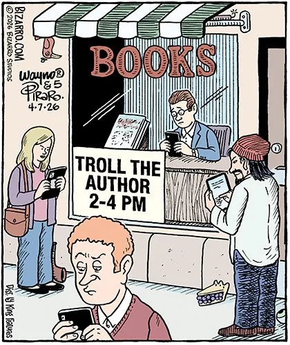 I’m Dan Piraro, the creator of the Bizarro newspaper comic, and this is my weekly blog post. The large Sunday comic above is mine, as are all of the non-cartoon comments below.